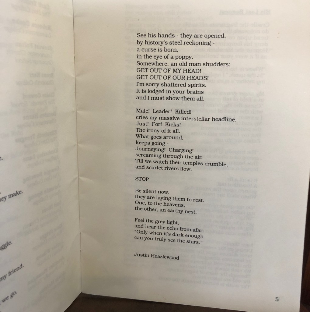 In grade 12 at Hellyer College I was published in a schools poetry anthology edited by Don College’s Shane Wolfe.