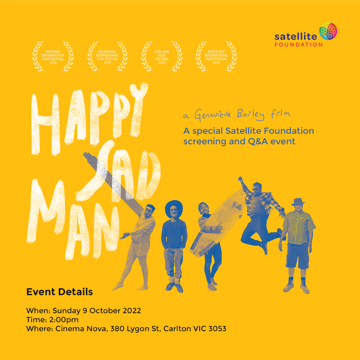 - If you’re in Melbourne there’s a special screening of the documentary Happy Sad Man coming up. If not, keep an eye out for it appearing near you. Happy + sad (but not sappy, man). Click here for details.
